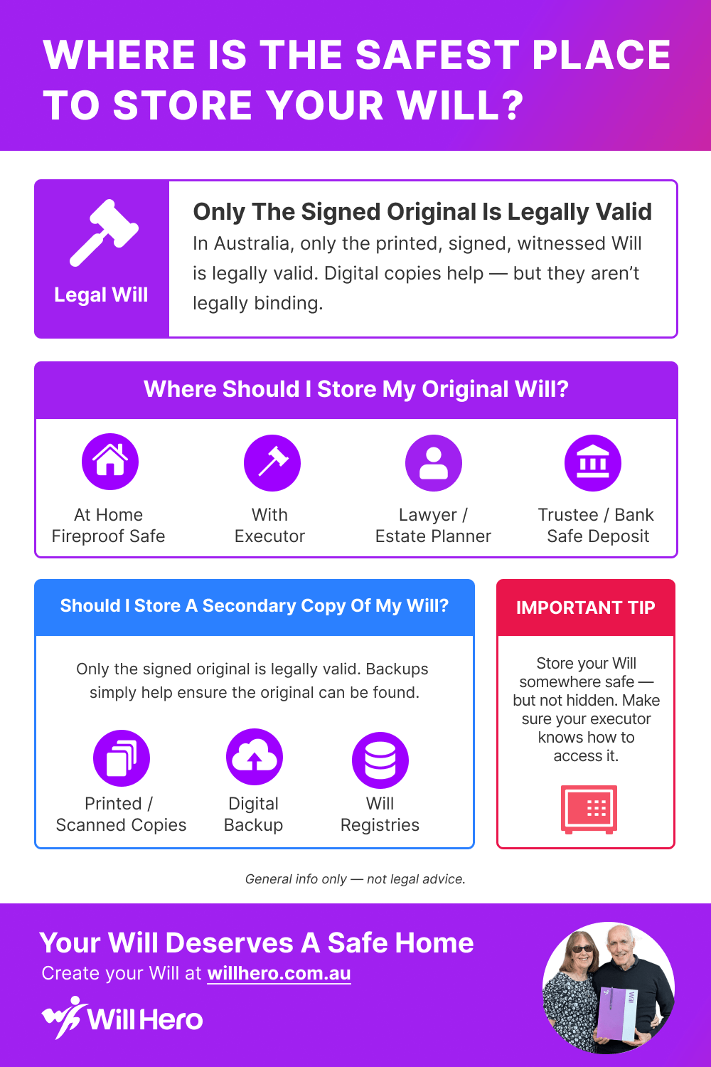 Before we get into storage options, it’s essential to understand that in Australia, your Will must be printed, signed on paper, and witnessed properly to be legally valid. While services like Will Hero let you create and download your Will online, it’s the signed physical document that courts will accept.
