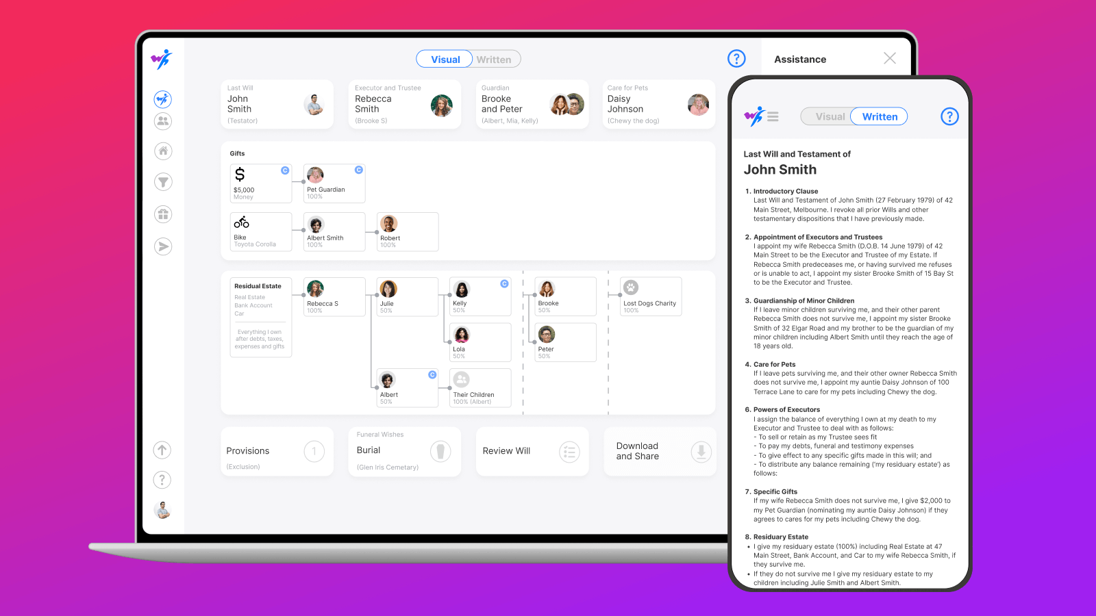 Will Hero makes it easy for people to map out how they want their estate to be distributed. This visual-first approach makes it easier for people to see and understand what their Written Will contains, which is drafted from their visual design. Learn more about how our process works and see pricing options for your will creation.