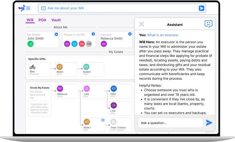 Will Hero's AI Assistant is here 24/7 to answer your questions — just like a lawyer would, but instantly. Ask about your Will, your people, your estate, or how to use Will Hero.