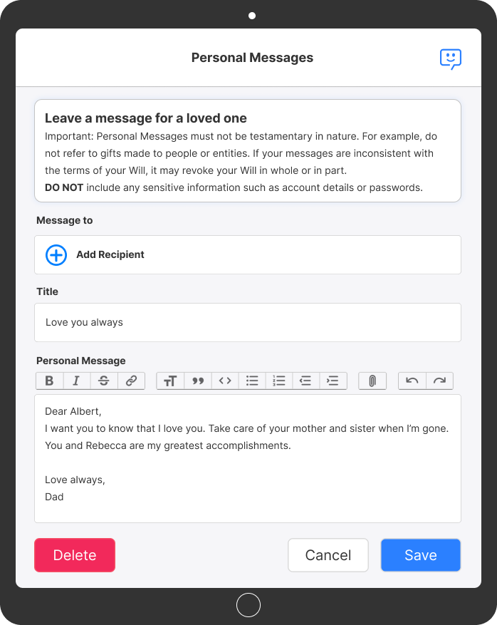 Leave messages for specific loved ones - be it your spouse, children or a friend. Compose your message using a rich text editor, embed images or add attachments including documents, PDFs and videos.