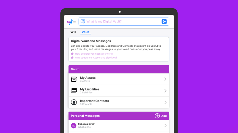 The Digital Vault is a secure feature built into Will Hero's platform that safely stores important information in one central location. Whether it's final messages for your loved ones, records of your assets and liabilities, or vital contact details, the Digital Vault makes sure your legacy is clearly documented and easily accessible when it matters most.